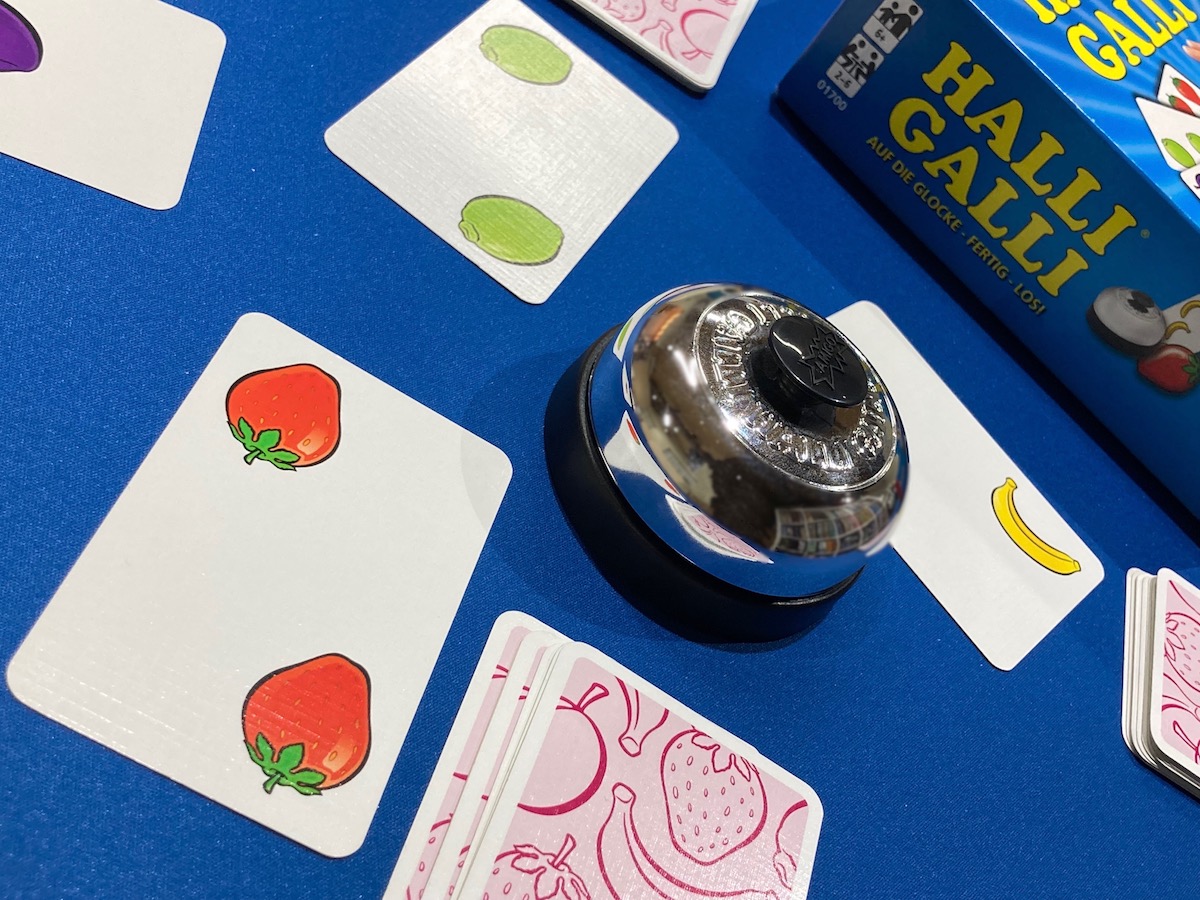 「ハリガリ」は各プレイヤーが自分の山札から1枚ずつカードをめくっていき、5個の同じフルーツが揃ったら素早くベルを鳴らして全てのカードを回収することを目指すスピード系ボードゲーム。ゲーム初心者も気軽に楽しめる作品です。