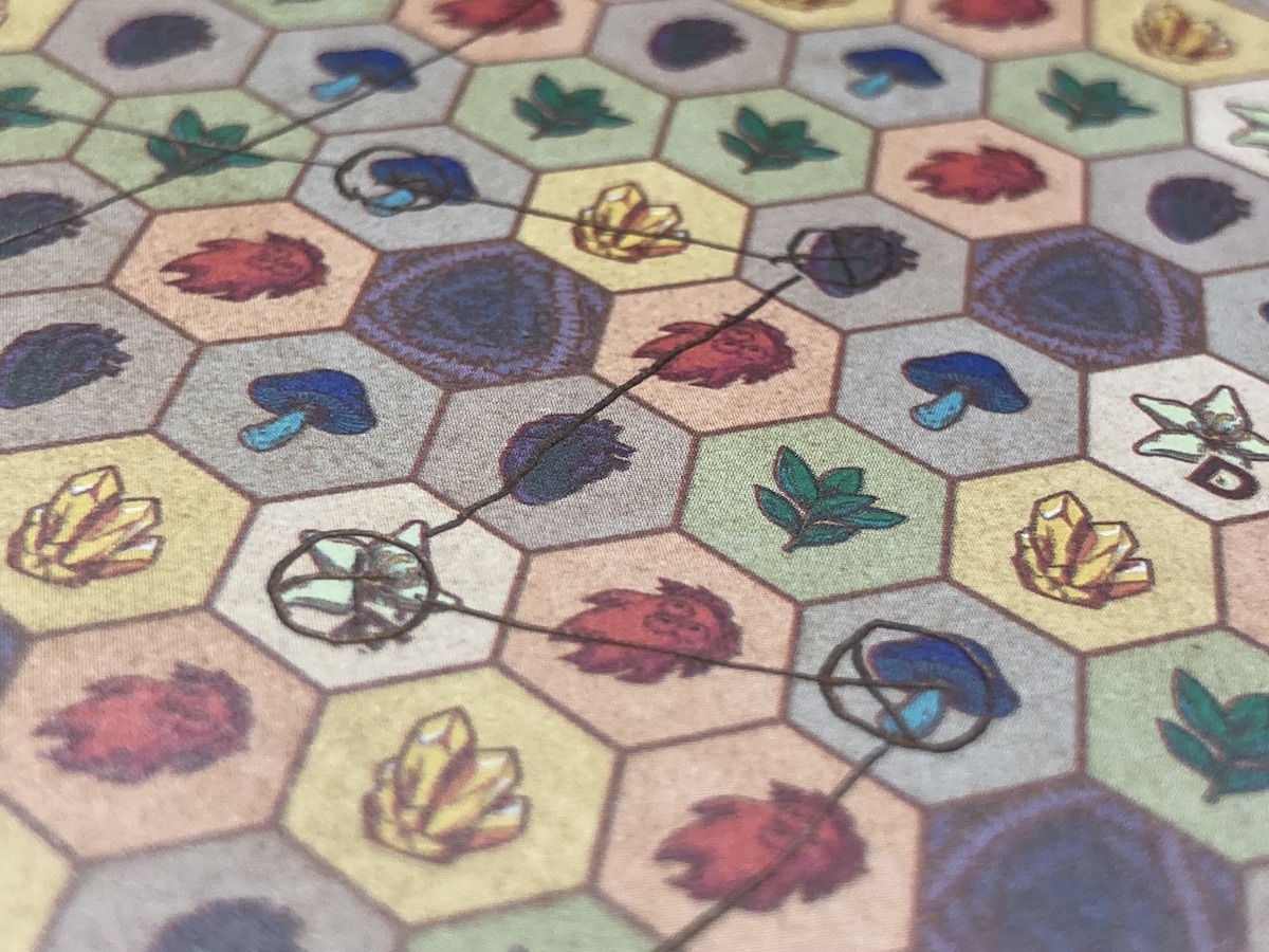 「ポーションポットトレイル」はダイスの目に沿って、専用シートに線や丸を記入しながら進めていく紙ペン系のボードゲームです。
