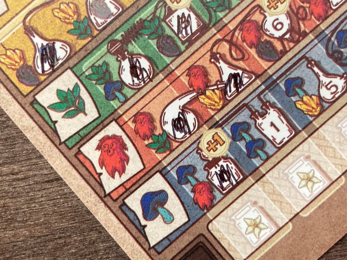 材料を集めてポーションを作ることで、新たな材料を獲得したり、探索する回数を増やすことができるようになります。どのポーションから集めていくか、専用シートにある材料をどのように線引きしていくかでゲームの勝敗を分けます。