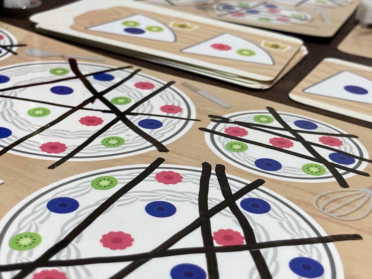 「きりきりケーキ」は2分間の制限時間内にペンで線引きをして、注文カードのトッピング通りのケーキのカットをより多く切り分けることを目指すボードゲームです。