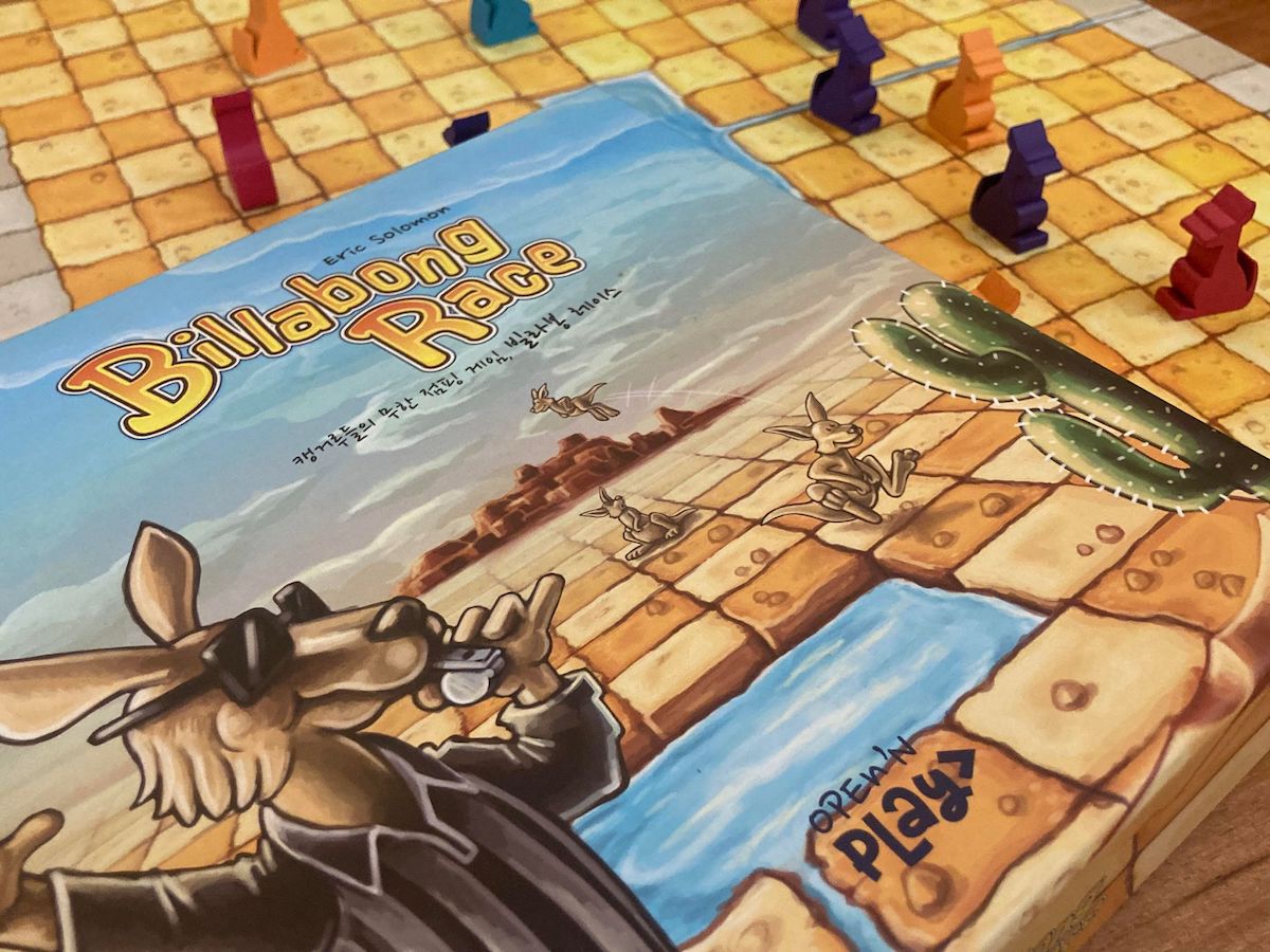 「ビラボング」はカンガルーの駒を使って遊ぶ運要素なしのレースゲーム。すごろくというよりはチェスや将棋のような感覚で頭を使いながら遊びます。カンガルーと同じように実際に他の駒を飛び越えて一気に進められたときの爽快感が楽しい作品です。